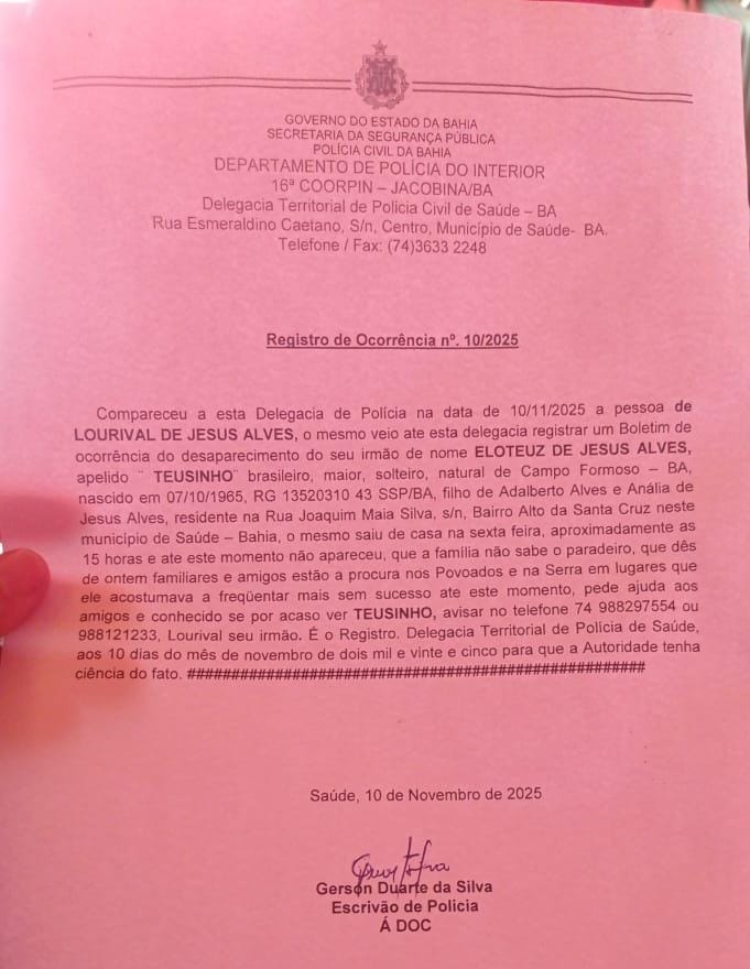 Segundo familiares, Teuzinho nunca havia ficado tanto tempo sem dar notícias, o que intensifica o desespero de parentes e amigos. Um Boletim de Ocorrência já foi registrado na Delegacia de Polícia Civil do município, porém, até o momento, nenhuma informação concreta sobre seu paradeiro foi encontrada.