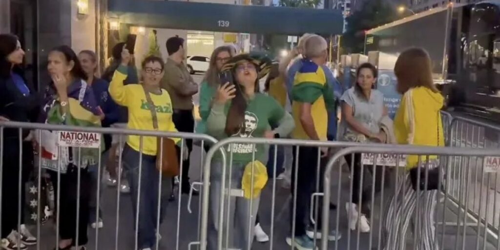 Os manifestantes vestiam camisetas do Brasil e do ex-presidente Jair Bolsonaro, carregavam bandeiras nacionais e gritavam frases como “Lula ladrão” e “O Brasil ouvisse Trump”.