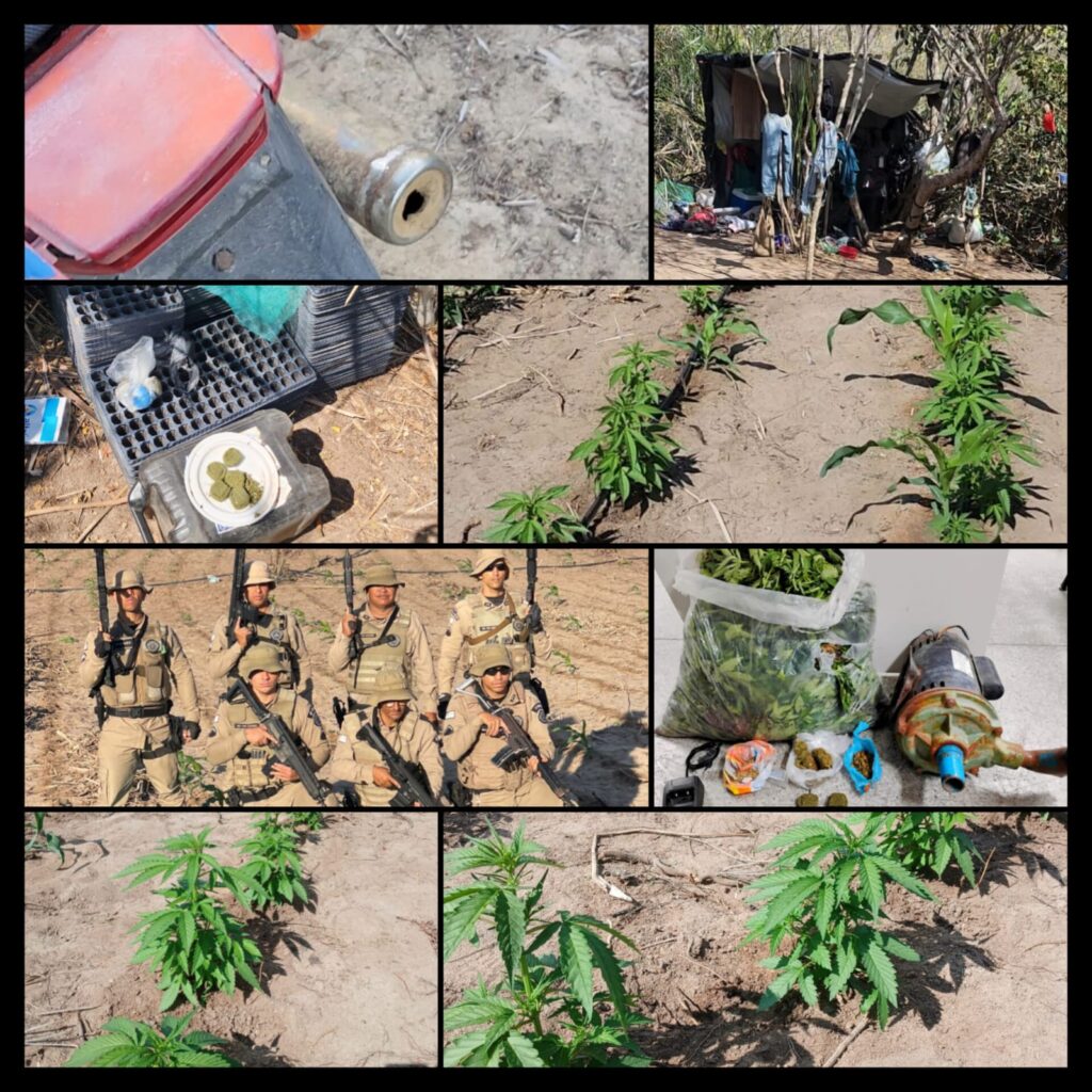 No local, foram erradicados aproximadamente 30.000 pés de maconha.*Materiais Apresentados:** 01 Saco plástico grande, transparente, contendo vários pés de maconha;* 01 Bomba d’água de marca WEG;* 02 Sacos plásticos, contendo ervas secas, análogas a maconha;* 01 Saco plástico, contendo várias sementes;* 5 Tablets pequenos de maconha prensada;* 01 Carregador de rádio comunicador;* Moto, CG 125, sem placa, de cor vermelha, chassi suprimido.*N° da Ocorrência:* 740255/2025 *Recurso*: VTR – 8.0609/ VTR 8.0603 – 4ªCIA RURAL.